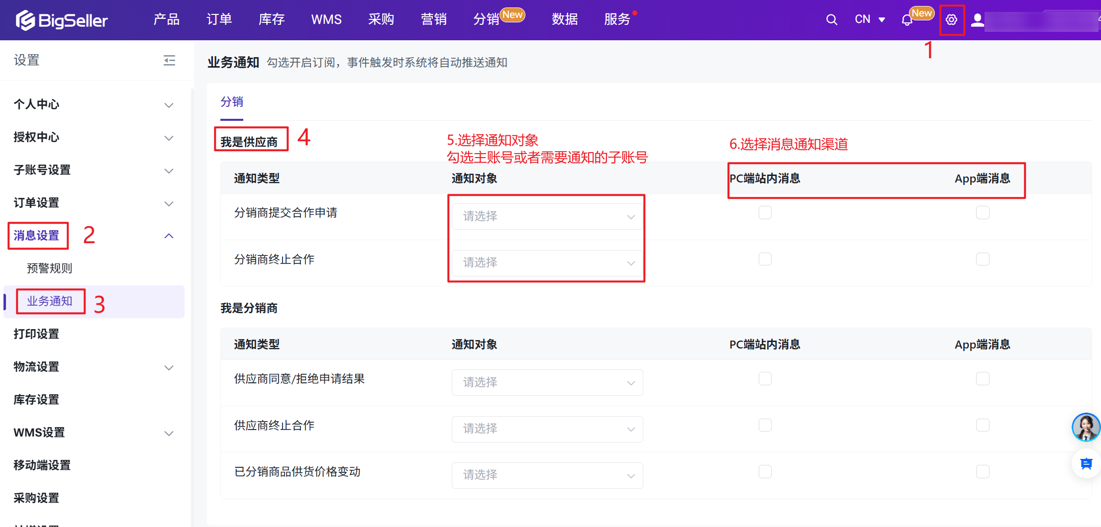 可开启业务通知,勾选开启订阅,有分销商提交合作申请,或者分销商终止合作时,接收PC端站内消息和APP端消息。
