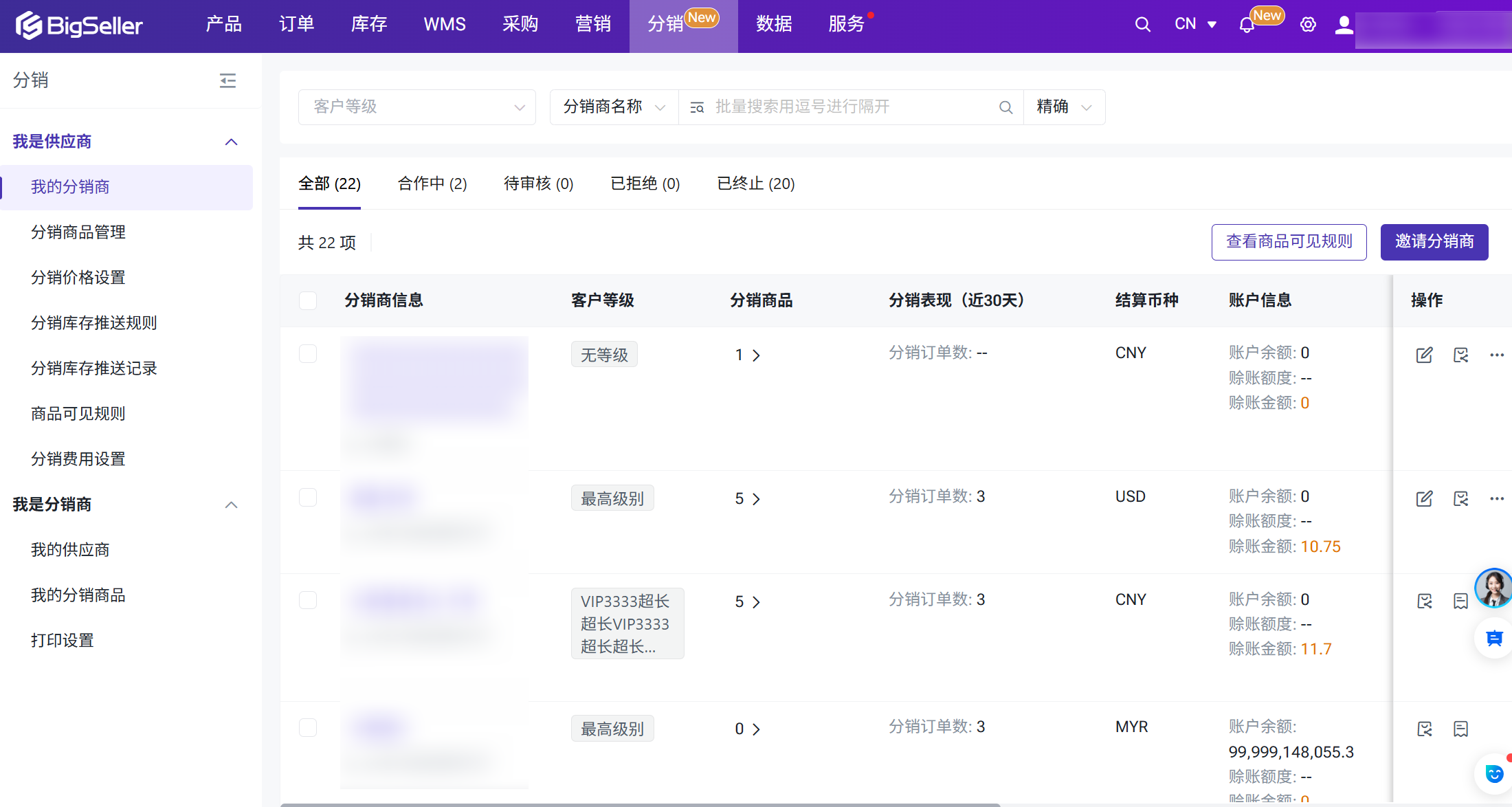 在【我的分销商】页面中,可对合作中的分销商执行以下操作