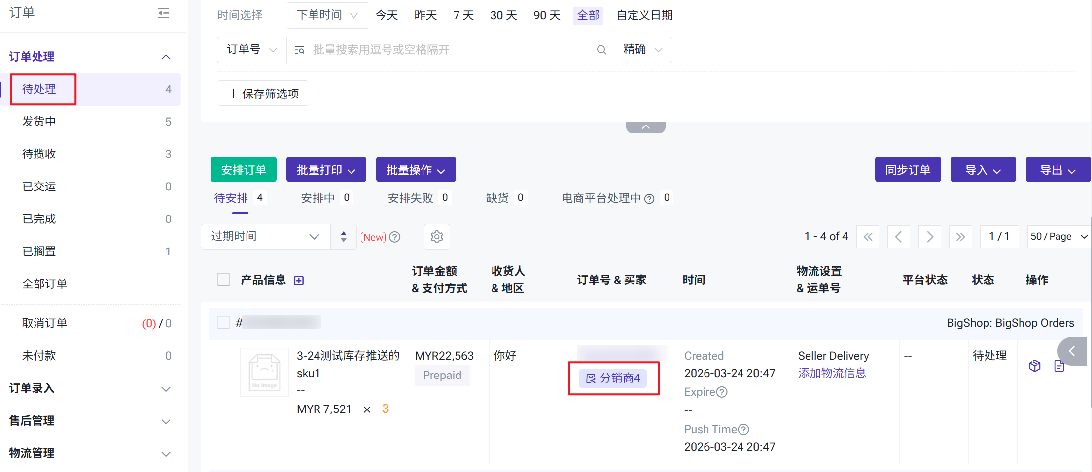 当和分销商成功建联之后,分销商可将订单推送至供货商的BigSeller内进行订单履约,订单将会被推送至【待处理】列表,生成供销订单,由供货商完成拣货打单并且发货。5.1:安排订单